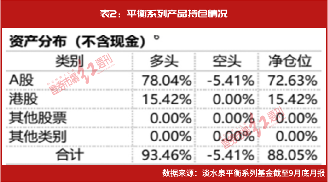 在实操中,淡水泉也采取了一定的对冲手段,不过仓位较低。以平衡系列为例,截至9月底,总资产中的空头持仓为5.4%,而多头持仓高达93.5%。作为一只主打平衡概念的产品,净多头仍高达九成。