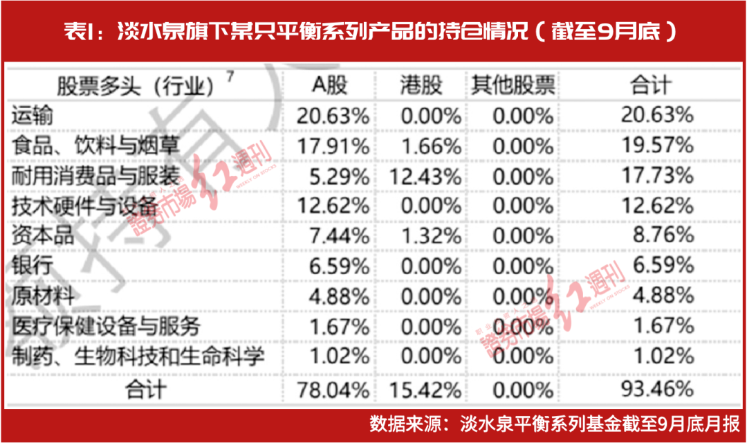 至于淡水泉平衡系列,投资人提供的月报显示,其基本复制了成长系列的投资思路,只不过重仓行业的顺序略有不同,前三大重仓分别是A股的交运、A股的食品饮料、港股的耐用消费品与服装。