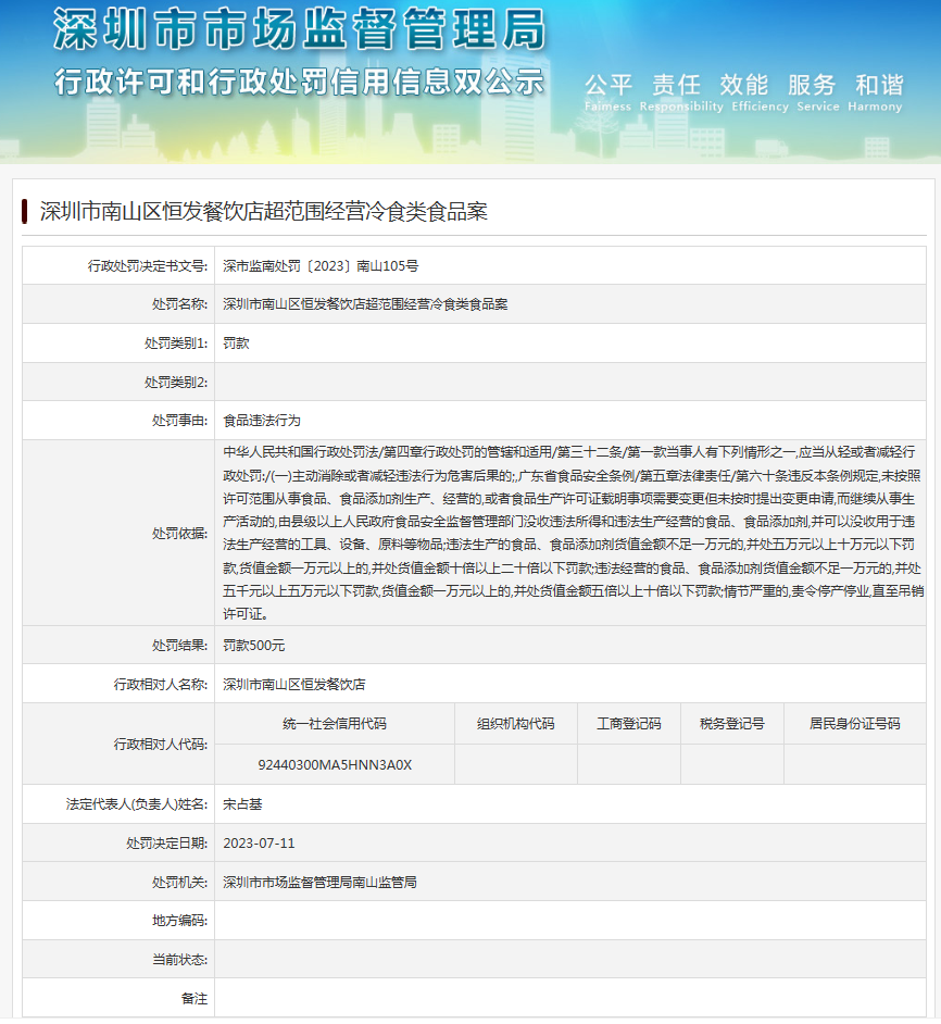 近日,深圳市市场监督管理局南山监管局发布行政处罚信息(深市监南处罚〔2023〕南山105号),涉及深圳市南山区恒发餐饮店超范围经营冷食类食品案。