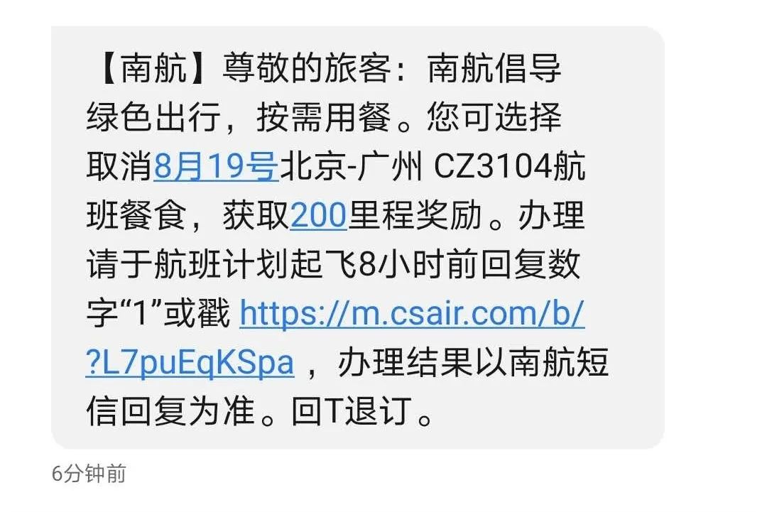 中国南方航空在2019年推出了“绿色飞行”模式,南联航空食品有限公司信息部经理段炼表示,旅客不仅可以在购票后选择不同种类的餐食,还可以选择不用餐,不用餐的旅客可以额外获得一定数额的里程积分。