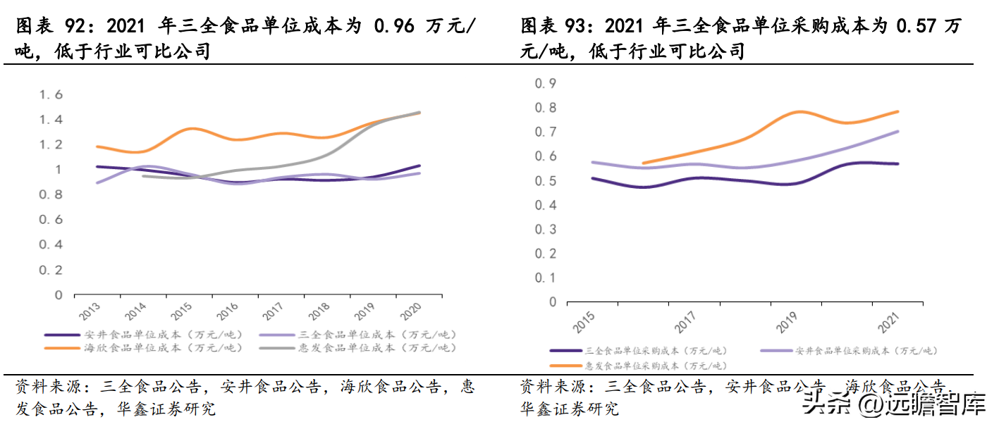 原料采购端看,由于原材料成本上涨,行业内各家企业单位采购成本均呈上升趋势,三全食品拥有较强议价能力及规模优势,单位采购成本由 2015 年 0.51 万元/吨略微上升至 0.57 万元/吨,与行业可比公司相比较低。