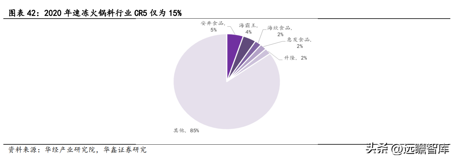 据华经产业研究院,安井食品为速冻火锅料行业龙头,2020 年市场份额为 5%,行业内其他公司主要包括海霸王、海欣食品、惠发食品、升隆,行业仍较分散,CR5 仅为 15%。随着龙头企业规模、渠道等优势凸显以及行业监管规范化,行业集中度有望进一步提升。