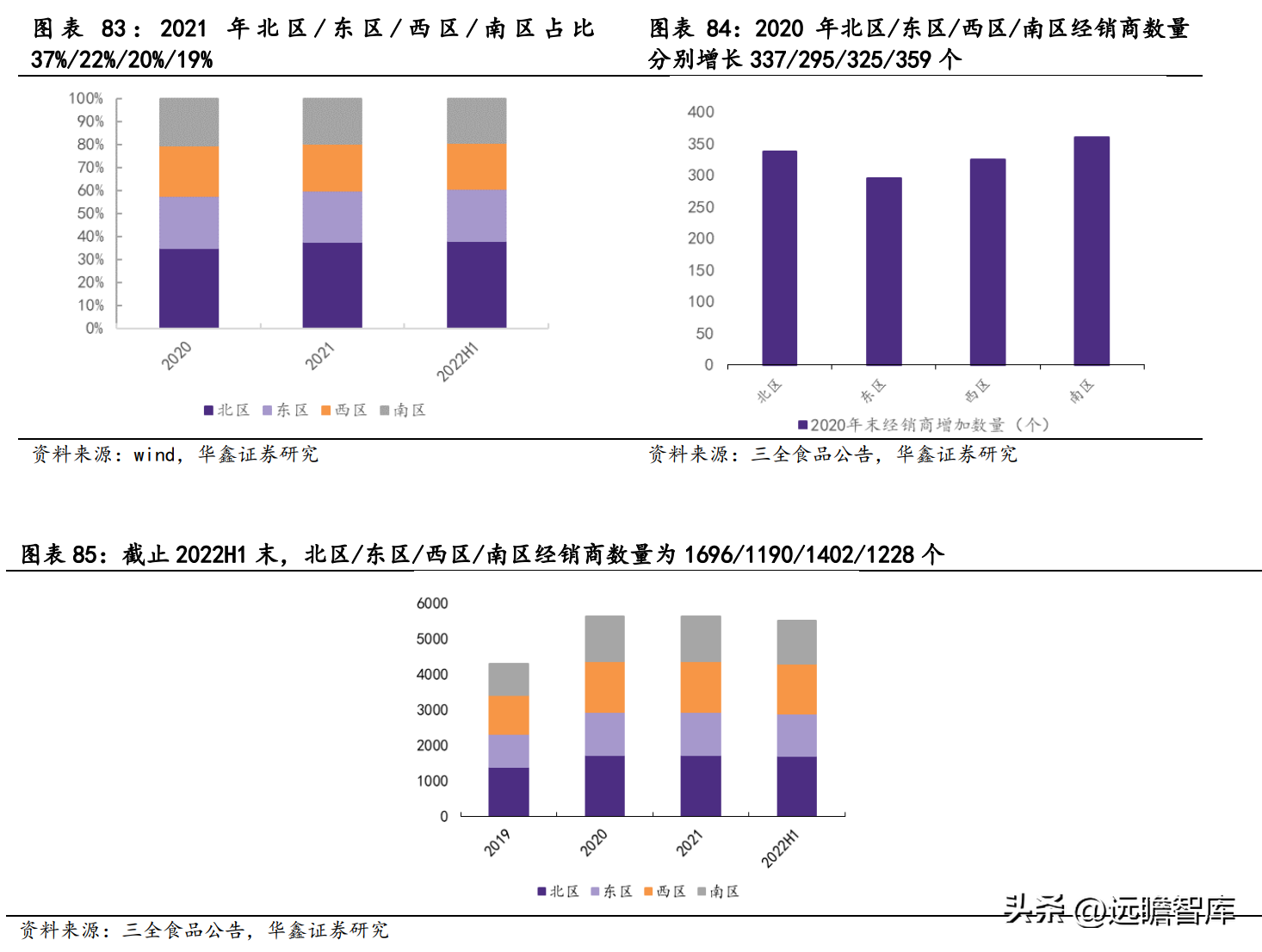 截止 2022H1 末,北区/东区/西区/南区经销商数量为 1696/1190/1402/1228 个,相比 2021 年末均减少,主要系渠道整合优化所致。