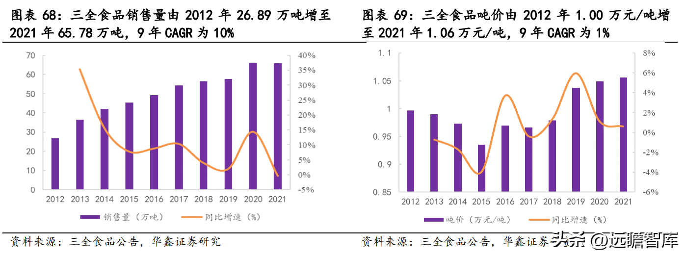 三全食品销售量由 2012 年 26.89 万吨增至 2021 年 65.78 万吨,9 年 CAGR 为 10%;吨价由 2012 年 1.00 万元/吨增至 2021 年 1.06 万元/吨,9 年 CAGR 为 1%,公司业绩增长主要依靠量增,均价呈缓慢上升趋势,产品结构优化初显成效。