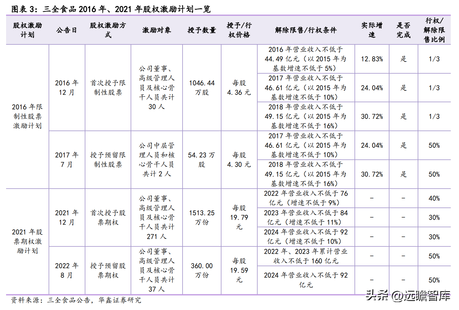 三全食品分别于 2014 年、2016 年、2021 年实施股权激励计划。其中 2016 年限制性股票激励计划的解除限售条件均已达成。