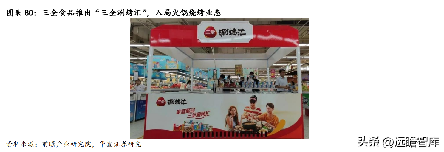 三全食品积极探索渠道发展空间,发掘新渠道、新业态,精准开发匹配渠道产品,有助于加速布局全温区、全渠道、全品类供应链平台,如公司通过投资一站式火锅烧烤食材连锁超市锅圈食汇,入局火锅烧烤业态,并于 2020 年推出“三全涮烤汇”,以店中店形式售卖火锅烧烤食材;同时聚焦更易触达消费者的农贸批发市场,推出高性价比产品,覆盖蒸饺、卡通包、馄饨、小笼包等多品类。此外,公司探索商超熟食区新业态,通过商超引流,提升品牌和产品知名度。