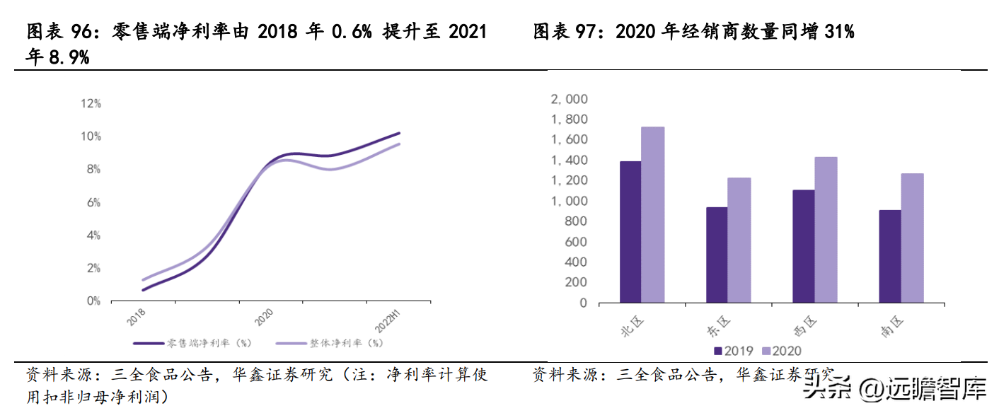 实行渠道改革后,零售端净利率由 2018 年 0.6% 提升至 2021 年 8.9%,利润占比由 2018 年 46% 增至 2021 年 92%,带动净利率大幅提升。同时,由于公司战略向经销渠道倾斜,经销商开拓力度加大,2020 年末经销商数量大幅增长至 5622 个,同增 31%。