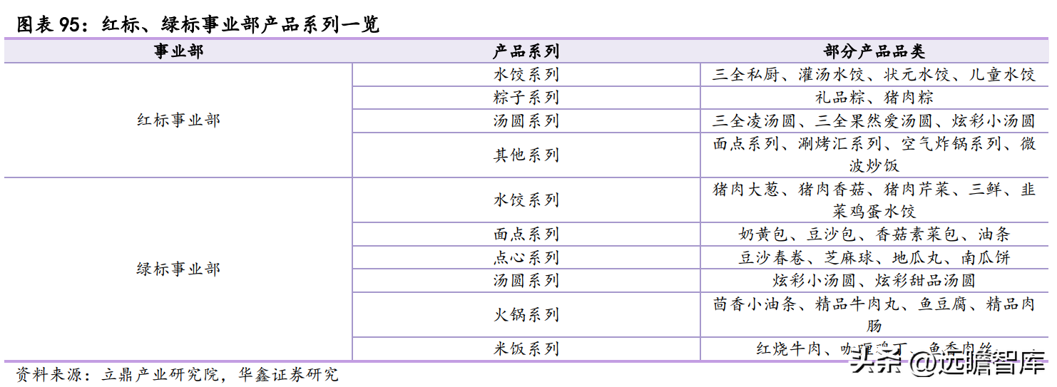 产品方面,红标和绿标事业部独立开展产品研发,零售端产品以速冻面米类为主,其中私厨水饺系列、儿童深海鱼系列、炫彩小汤圆等多个品类市场反应良好。餐饮端产品除水饺、汤圆等速冻面米类,逐步开拓火锅、菜肴等多个品类,打造差异化产品和特定消费场景,其中茴香小油条已提供给巴奴、海底捞、小龙坎等多家火锅连锁品牌,市场份额达 70%。