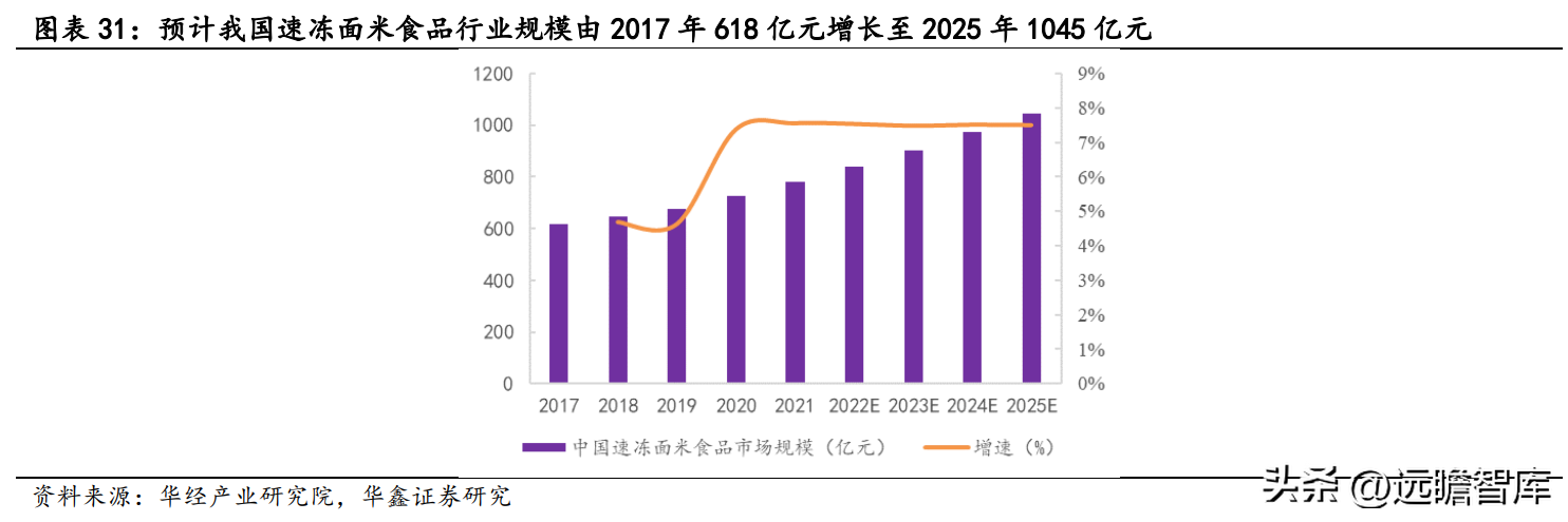 整体来看,我国速冻面米食品行业稳定增长,预计增速稳中趋缓,市场规模由 2017 年 618 亿元增长至 2025 年 1045 亿元,8 年 CAGR 为 6.79%。