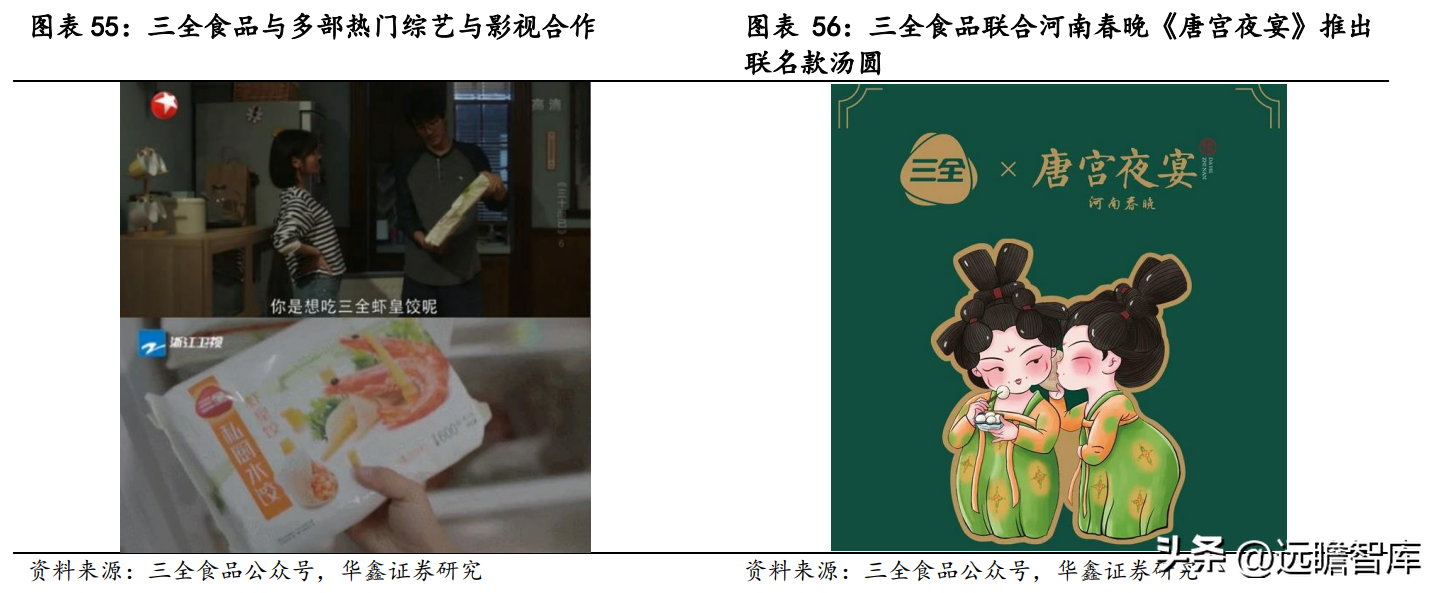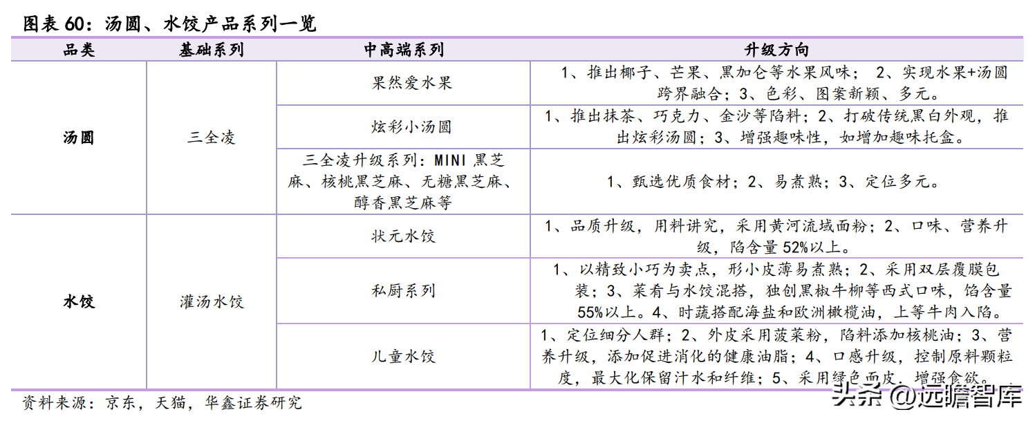 存量产品以保市场为目标,顺应消费升级趋势,持续升级口味、品质、包装,打造年轻化、个性化,拓展消费场景,如传统单品汤圆除基础品牌“三全凌牌”还包括高端品牌“果然爱水果”和“炫彩小汤圆”,实现消费场景由家庭餐桌向休闲零食、下午茶延伸。