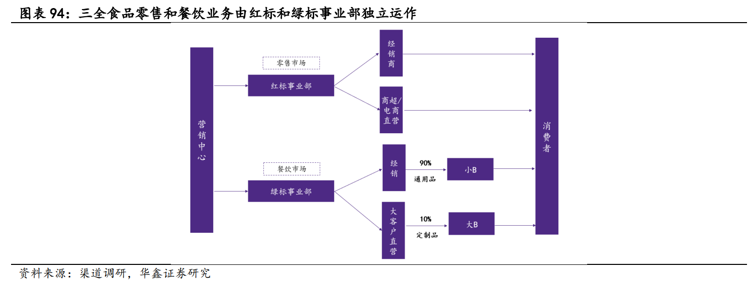 三全食品营销中心下设红标事业部和绿标事业部,分别由独立团队运作零售和餐饮业务,一方面减少渠道间内耗,提升效率,另一方面双事业部共享公司供应链和中后台系统,有利于渠道和供应链的协同发展。