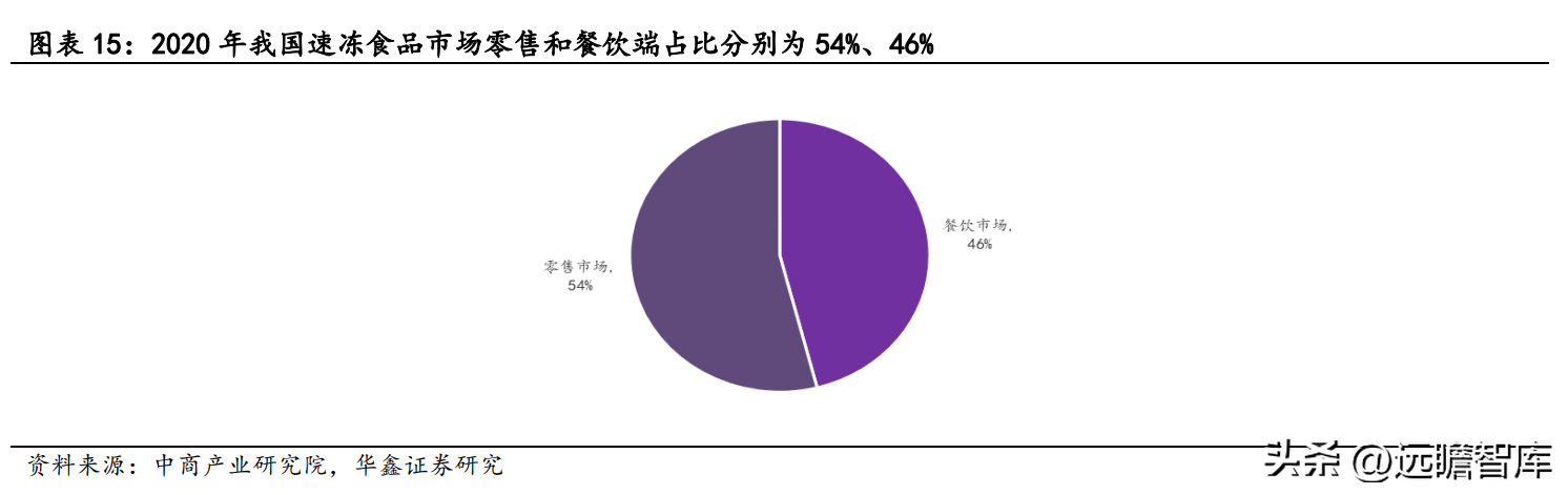 分渠道看,我国速冻食品市场以零售渠道为主,据中商产业研究院,2020 年零售和餐饮端占比分别为 54%、46%。