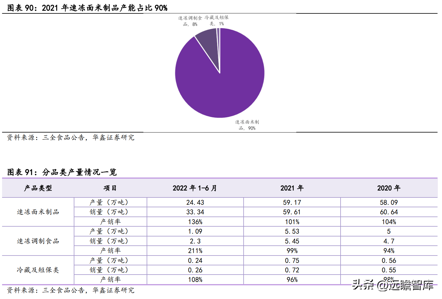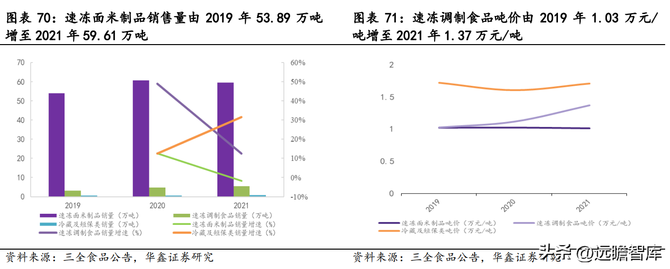 分品类看,2021 年速冻面米制品产量为 59.17 万吨,同增 2%,产能占比 90%,速冻调制食品和冷藏及短保类产量分别为 5.53 万吨、0.75 万吨,同增 6%、33%。