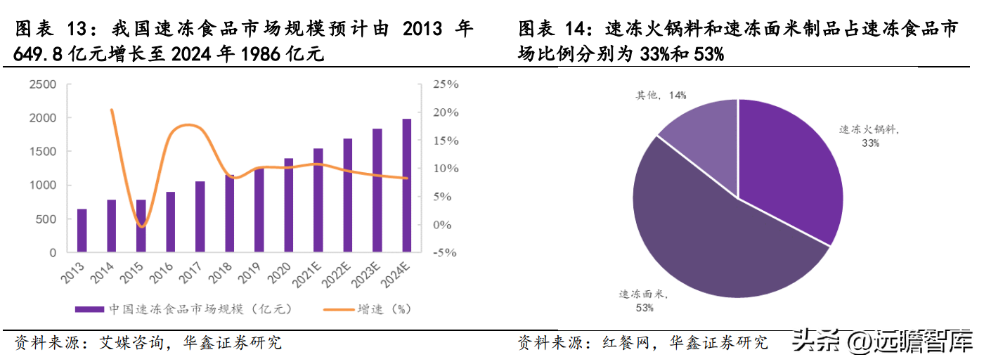 据艾媒咨询,我国速冻食品市场规模预计由2013年 649.8 亿元增长至2024年1986亿元,11 年 CAGR 为 10.69%。
