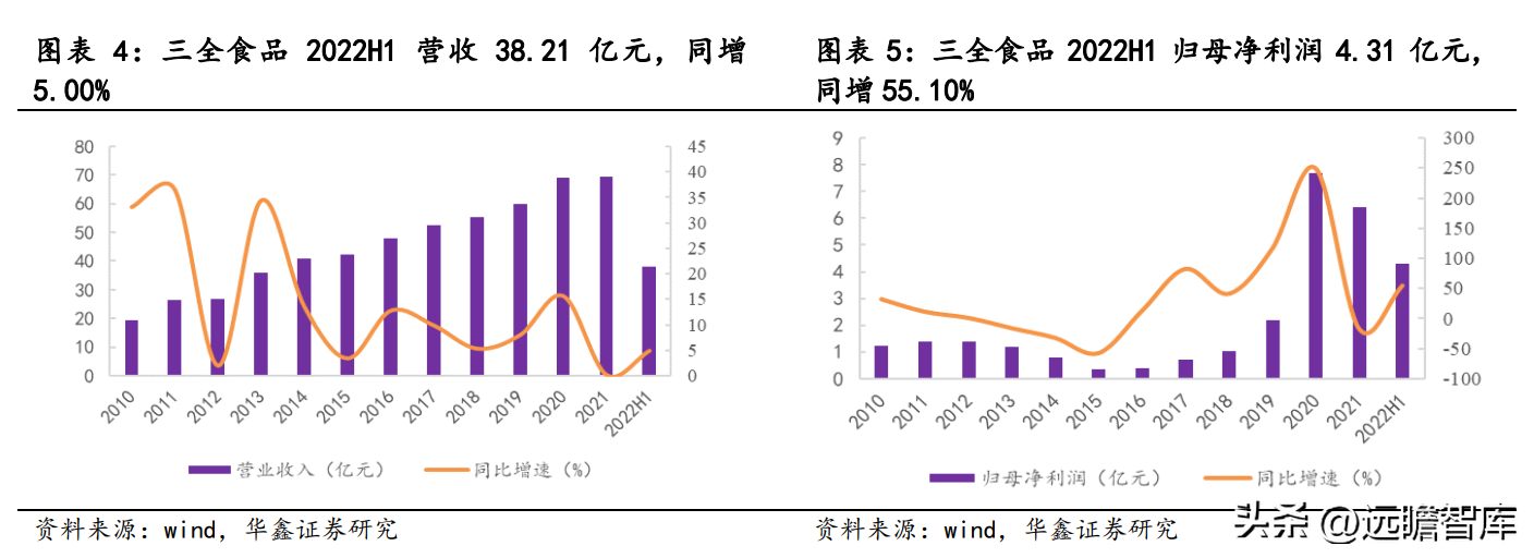 三全食品营收从 2010 年 19.23 亿元增至 2021 年 69.43 亿元,11 年 CAGR 为 12.38%;归母净利润从 2010 年 1.23 亿元增至 2021 年 6.41 亿元,11 年 CAGR 为 16.15%。2022H1 营收、归母净利润分别 38.21、4.31 亿元,分别同比增长 5.00%、 55.10%。