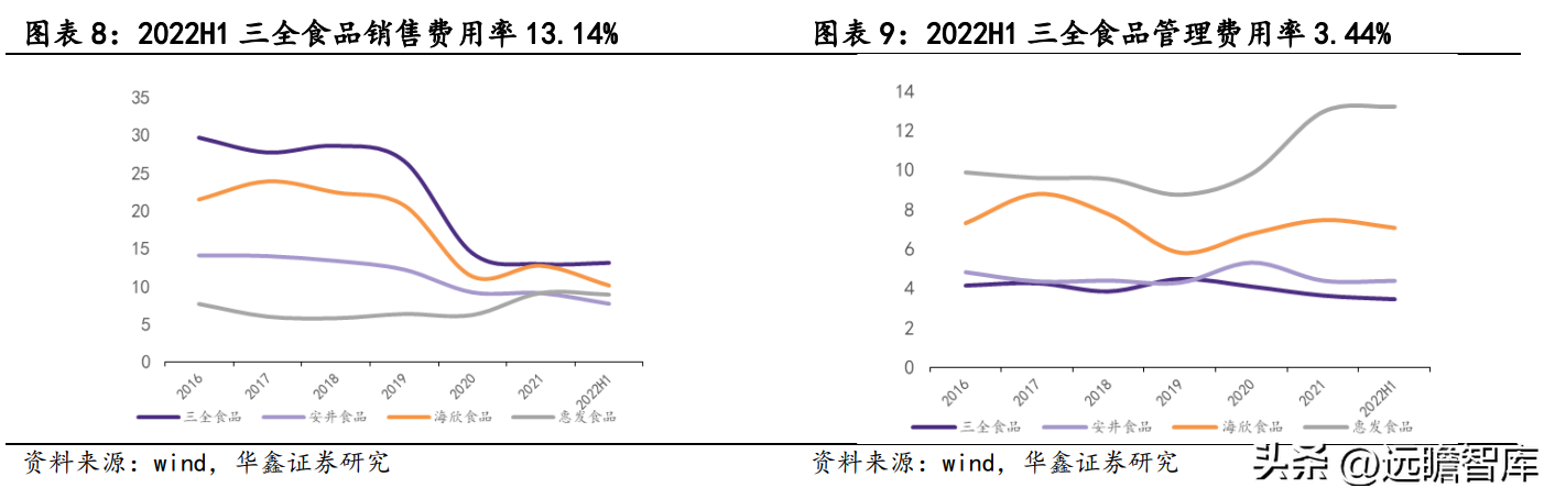 三全食品销售费用率与可比公司相比较高,2016-2019 年维持在 25%以上,通过渠道结构优化、产品结构调整及精细化管理,2021 和 2022 年分别下降至 14.42%、12.98%;管理费用率基本维持在 3% 至 4% 左右,在行业内处于较低水平,2021 年为 3.62%。