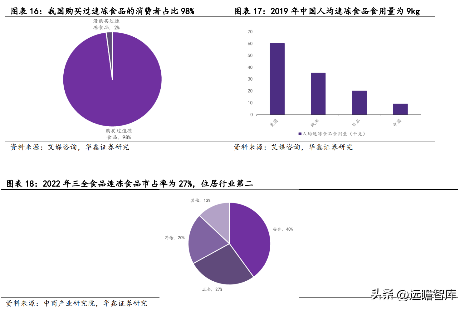 据艾媒咨询,我国速冻食品消费渗透率较高,购买过速冻食品的消费者占比 98%,但对标欧美和日本,我国速冻食品人均食用量仍较低。2019 年中国人均速冻食品食用量为 9kg,远低于美国 60kg,欧洲 35kg,日本 20kg,行业发展空间仍较大。
