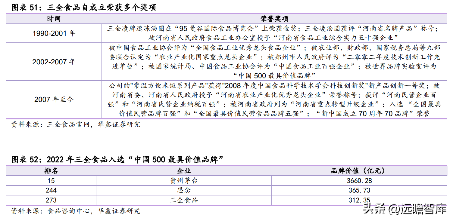 2008 年公司在深交所挂牌上市,步入快速发展时期。同时公司加大产品创新力度,花漾小云吞、果然爱水果汤圆、醇郁榴莲汤圆、鱼皮脆饺、速冻蒸蛋糕、自加热米饭等产品相继荣获行业创新产品奖。2013 年收购“龙凤”品牌,2014 年上线三全鲜食自动售卖机以及三全儿童系列,进一步丰富产品品类。随着产品品质和知名度提升,公司品牌力不断增强,2013 年品牌价值位居全国第 83 名,河南第 4 名。