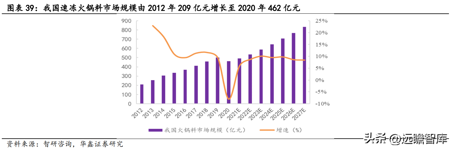 据智研咨询,我国速冻火锅料市场规模由 2012 年 209 亿元增长至 2019 年 502 亿元,7 年 CAGR 为 13.3%,2020 年下滑至 462 亿元,主要系疫情影响餐饮端,导致需求下降。预计 2021 年市场规模恢复至 490 亿元,2027 年增 长至 832 亿元,6 年 CAGR 为 9.2%。