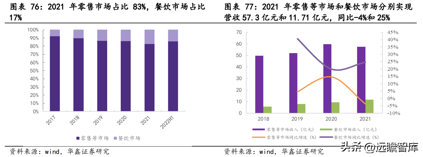 公司通过打造新品类和新渠道拓展零售业务,2021 年零售等市场占比超 80%。