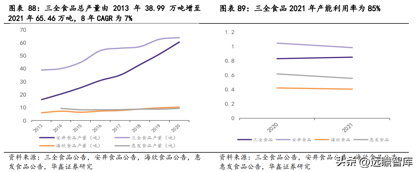 三全食品总产量稳定增长,由 2013 年 38.99 万吨增 至 2021 年 65.46 万吨,8 年 CAGR 为 7%,产量水平与可比公司相比较高。