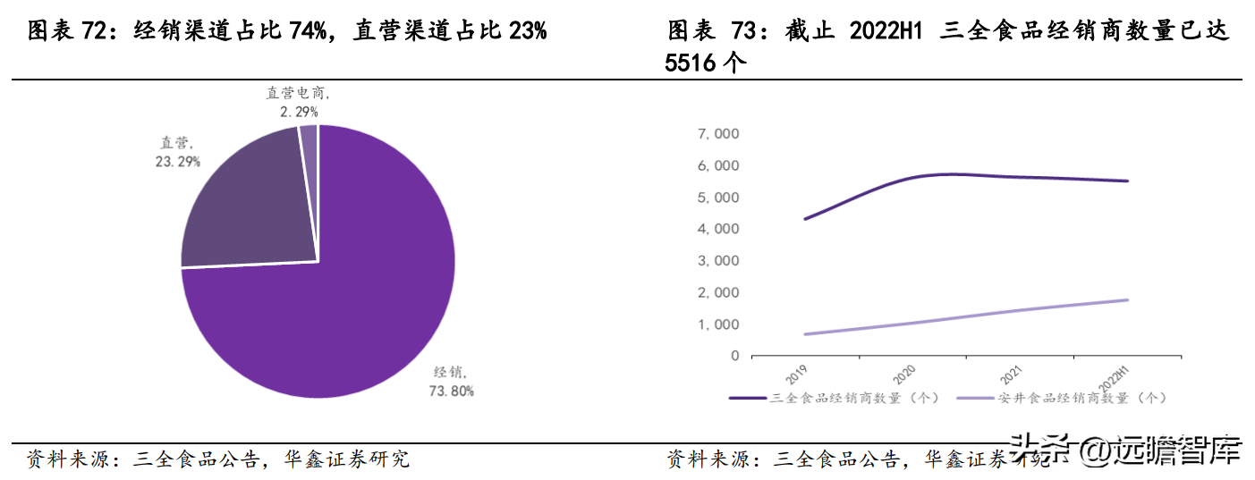 经销渠道主要依靠经销商针对零售终端及批发农贸、酒店餐饮、团膳等小 B 端销售和配送产品,推动渠道拓展和下沉,截止 2022H1 公司经销商数量已达 5516 个,经销网络遍布全国。