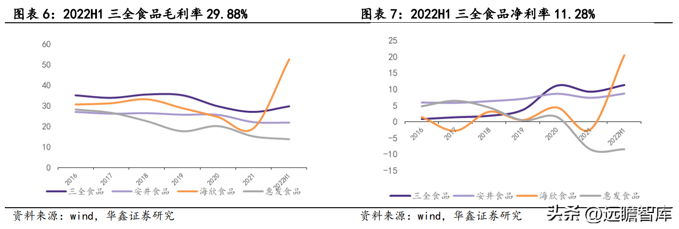 三全食品毛利率在行业处于较高水平,长期维持在 30%以上,2020 和 2021 年由于会计准则变更后运费由销售费用调整至营业成本及渠道结构调整,分别下降至 29.87%、27.17%,仍在行业中处于较高水平。