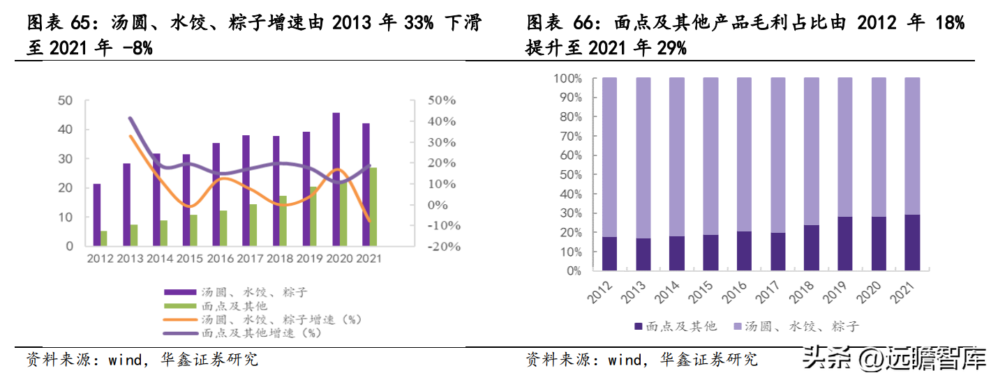 随着传统单品汤圆、水饺、粽子规模逐步扩大,同比增速由 2013 年 33% 下滑至 2021 年-8%;面点及其他产品(面点、点心、速冻调制食品、冷藏及短保类)增速基本维持 20%左右,高于传统单品增速,带动公司业绩增长。