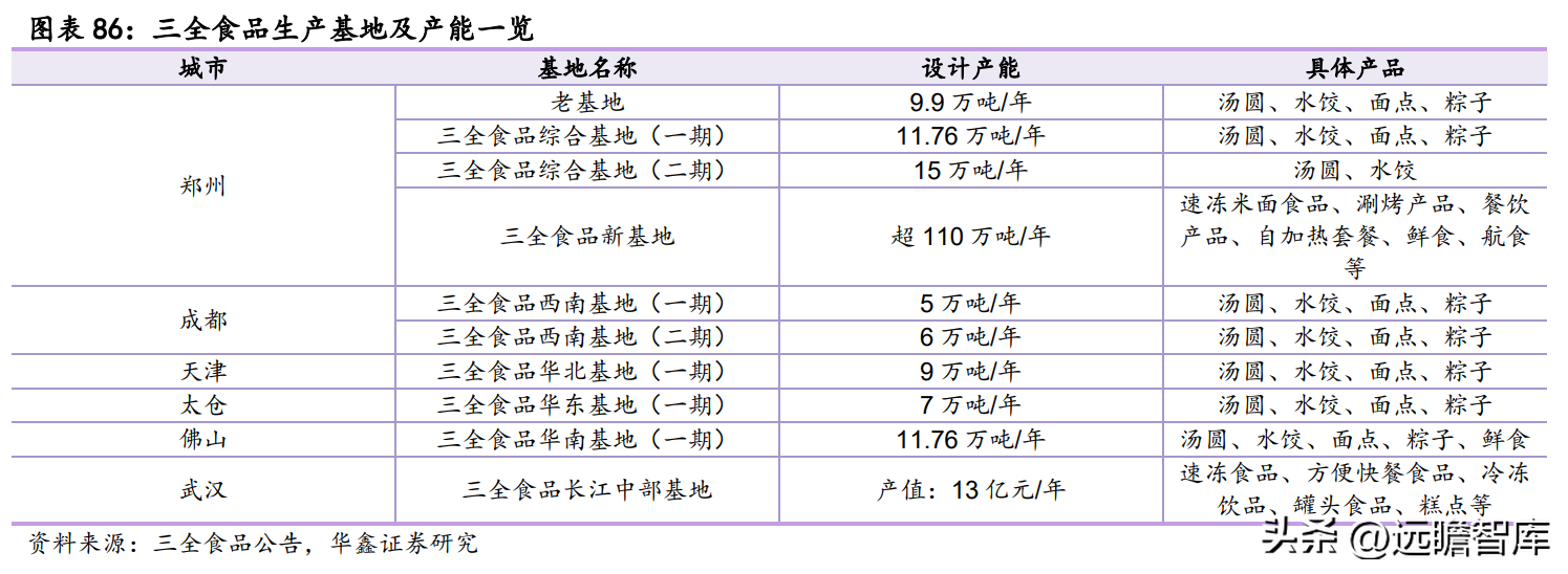 三全食品目前已形成全国化生产基地布局,生产能力覆盖郑州、成都、天津、太仓、佛山等核心城市群,所有工厂投产后预计总产能超 180 万吨/年(未包含武汉工厂)。