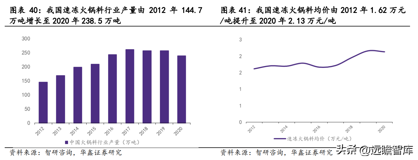 从量看,据智研咨询,我国速冻火锅料行业产量稳定增长,由 2012 年 144.7 万吨增长至 2020 年 238.5 万吨,8 年 CAGR 为 6.4%。