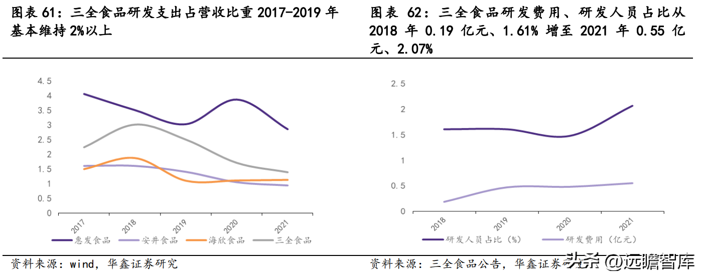 三全食品研发费用从 2018 年 0.19 亿元增至 2021 年 0.55 亿元,3 年 CAGR 为 43%,研发人员占比由 2018 年 1.61%增至 2021 年 2.07%。