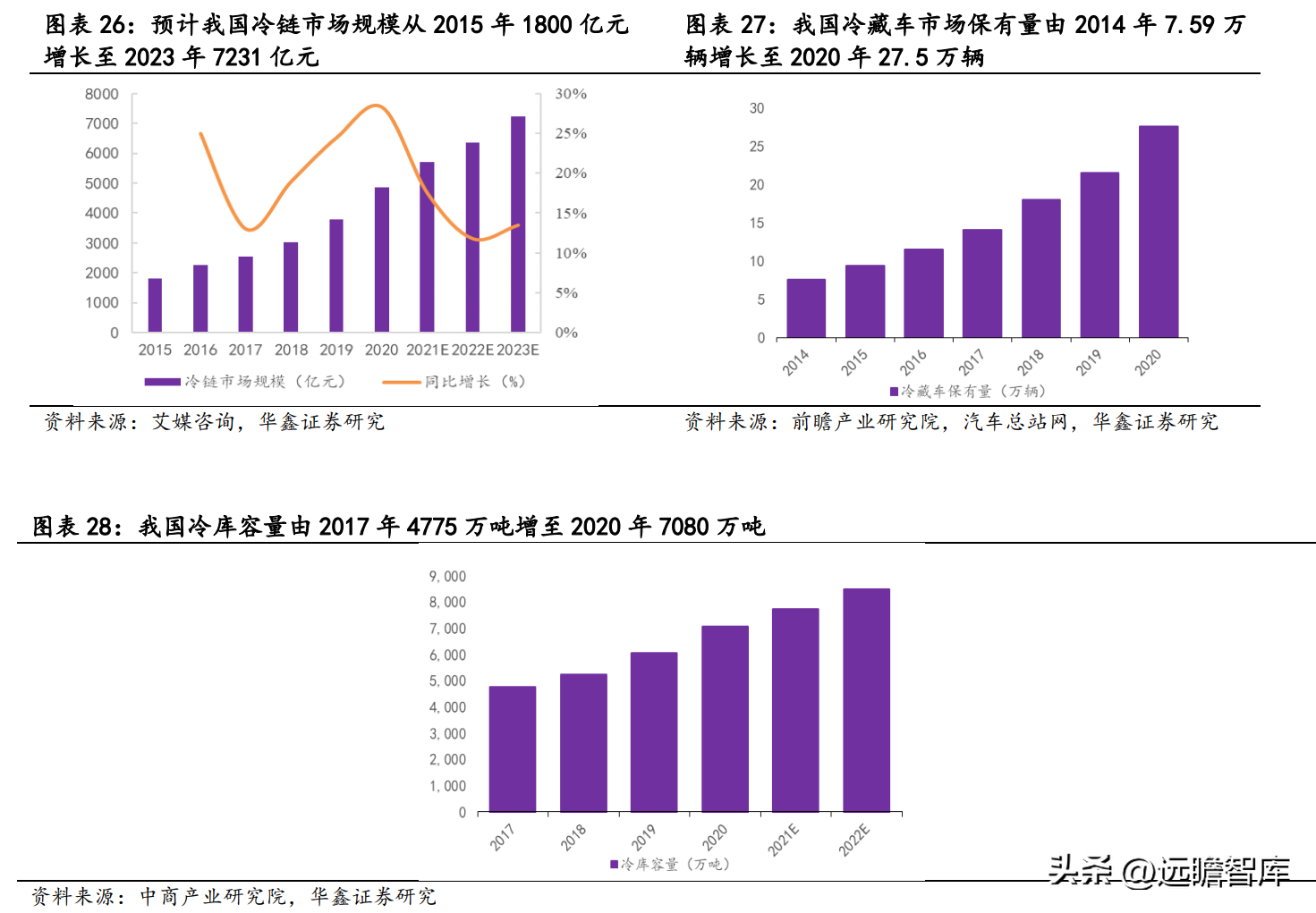 基础设施方面,我国冷藏车市场保有量由 2014 年 7.59 万辆增长至 2020 年 27.5 万辆,6 年 CAGR 为 23.9%;冷库容量由 2017 年 4775 万吨增至 2020 年 7080 万吨,3 年 CAGR 为 14%。