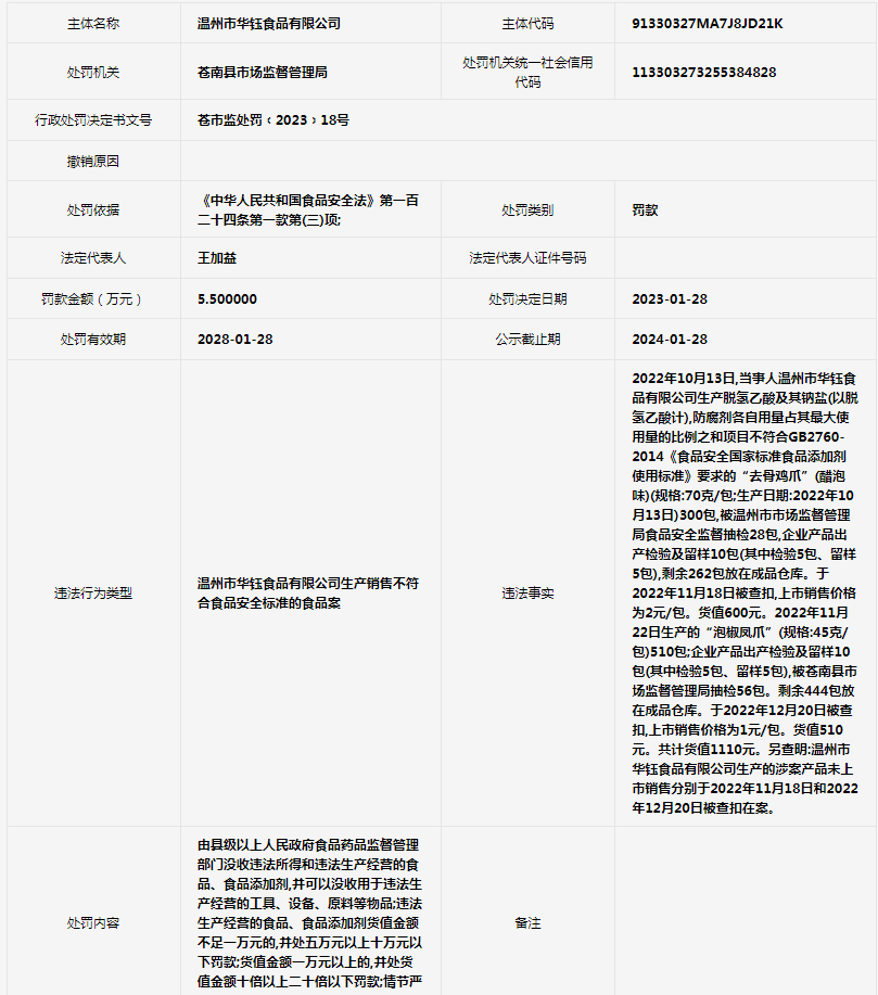 1月28日,苍南县市场监督管理局作出苍市监处罚﹝2023﹞18号处罚决定书。信用中国(浙江温州)官网载明:温州市华钰食品有限公司因生产销售不符合食品安全标准的食品,依据《中华人民共和国食品安全法》第一百二十四条第一款第(三)项,被处罚5.5万元。