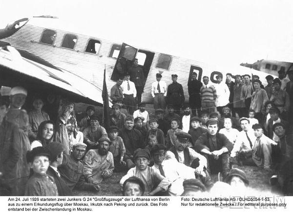 1926年7月26日,仅在德国汉莎航空公司成立6个月后,两架装备三台发动机的Junkers G24型飞机从德国柏林起飞飞往北京,该图片慑于中转点莫斯科