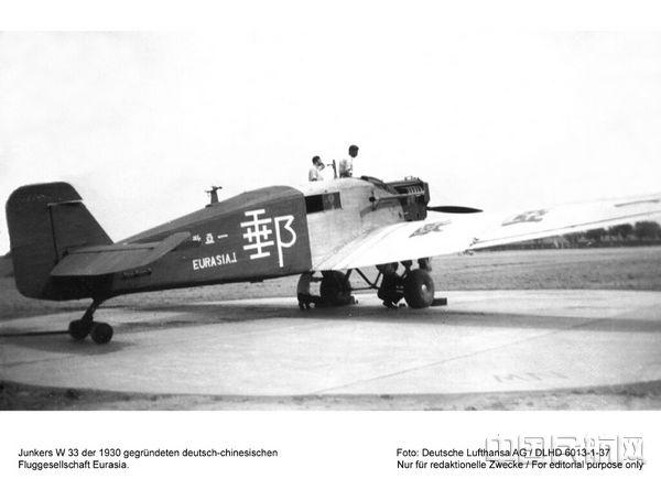 汉莎航空于1930年与中国政府成立欧亚航空邮运股份有限公司,图片为Junkers W 33飞机