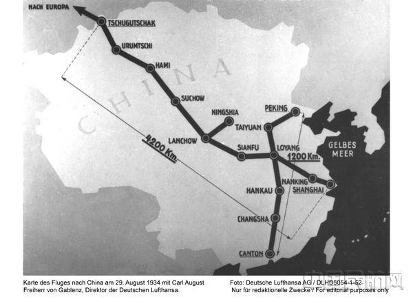 1926年7月24日,汉莎航空两架容克G24从柏林起飞,分10阶段、耗时6周抵达北京,总航程达1万公里,揭开了汉莎航空与中国进行航空往来的序幕。